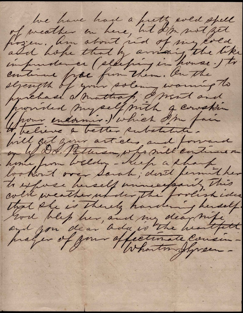 Will get your articles and forward on to Dr. Patterson who will continue on home from Weldon. Keep a sharp lookout over Sarah; don’t permit her to expose herself unnecessarily this cold weather under the foolish idea that she is thereby hardening herself. God bless her and my dear wife and you, dear Ada, is the heartfelt prayer of your affectionate cousin, — Wharton J. Green