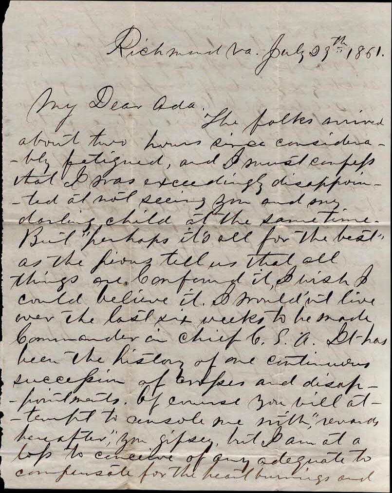 The folks arrived about two hours since considerably fatigued and I must confess that I was exceedingly disappointed at not seeing you and my darling child at the same time. But “perhaps it’s all for the best” as the pious tell us that all things are. Confound it, I wish I could believe it. I wouldn’t live over the last six weeks to be made Commander in Chief, C. S. A. It has been the history of one continuous succession of crosses and disappointments. Of course you will attempt to console me with “rewards hereafter,” you gypsey, but I am at a loss to conceive of any adequate to compensate for the heart burnings and annoyances which I have had to endure. I trust, however, that they are now about at an end. But this sickly spirit of complaining is unsoldierly. Believe me, Ada, no one ever heard me give utterance to it except yourself. Keep it to yourself.