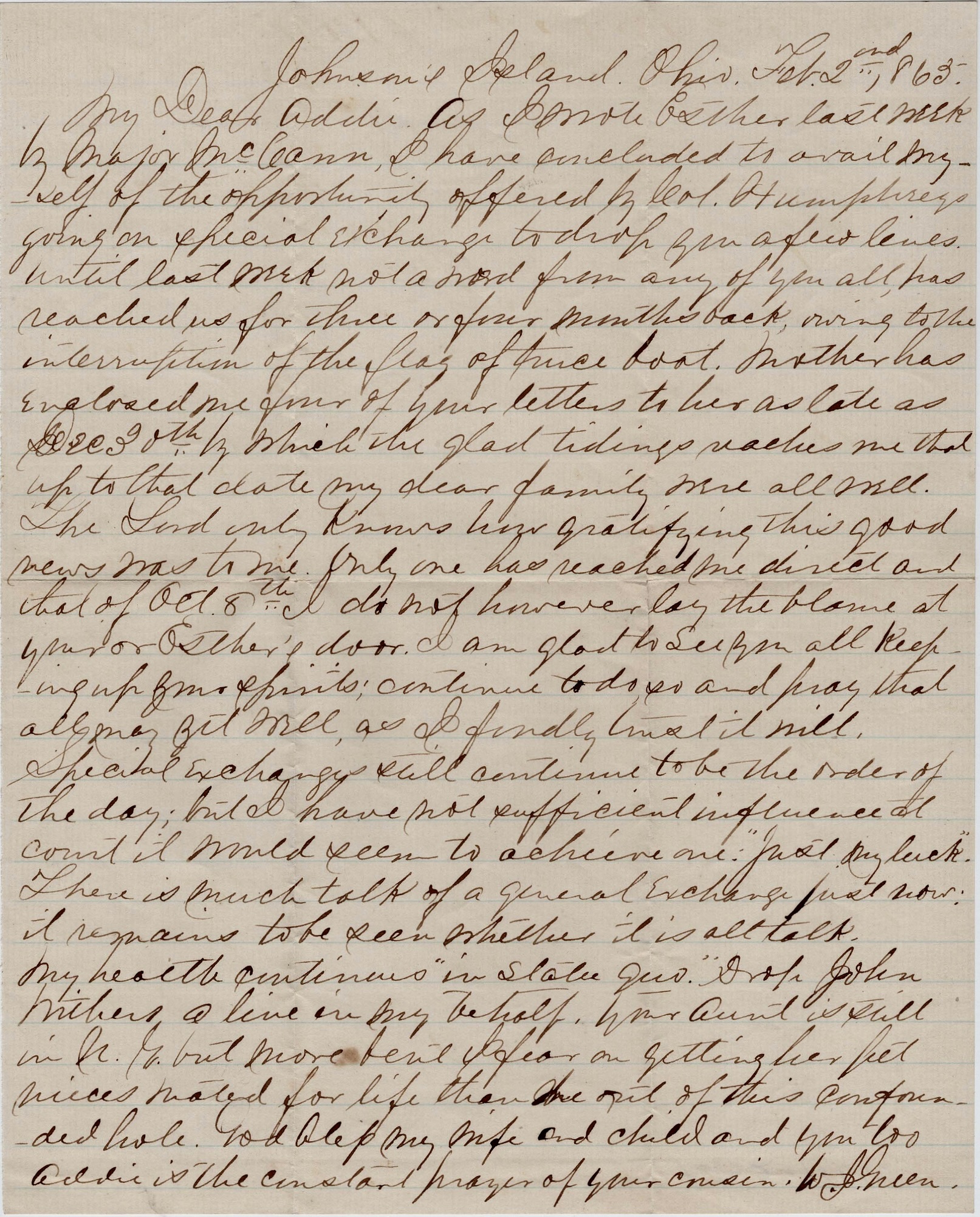 As I wrote Esther last week by Major McCann, I have concluded to avail myself of the opportunity offered by Col. Humphreys going on special exchange to drop you a few lines. Until last week, not a word from any of you all has reached us for three or four months back owing to the interruption of the flag of truce boat. Mother has enclosed me four of your letters to her as late as December 30th by which the glad tidings reaches me that up to that date my dear family were all well. The Lord only knows how gratifying this good news was to me. Only one has reached me direct and that of October 8th. I do not, however, lay the blame at your or Esther’s door. I am glad to see you all keeping up your spirits; continue to do so and pray that all may get well as I fondly trust it will.