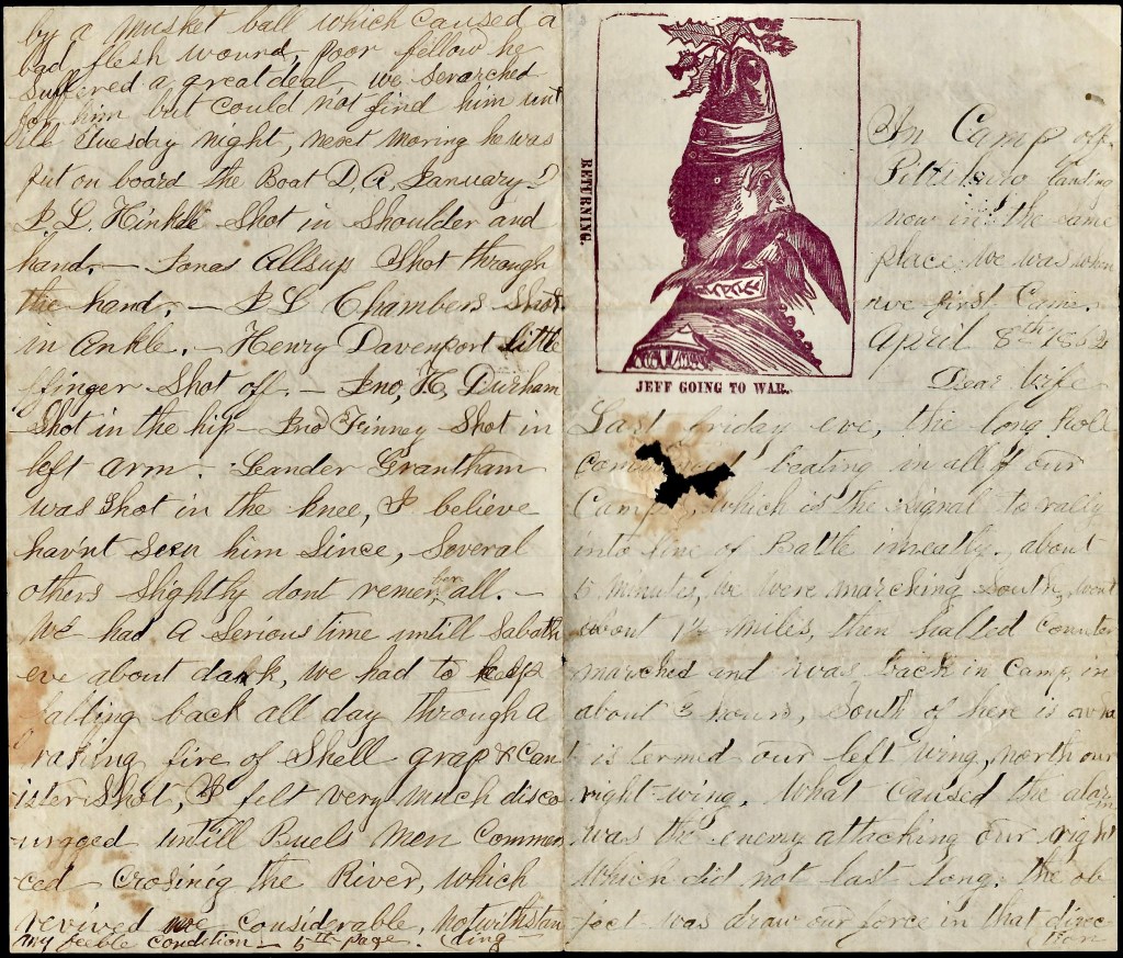 “I guess you hav herd before this time that I hav see the monkey dance. I did not enjoy the 6 of April as much as I have enjoyed some Sundays as we had to brake the Sabath by shooting and shooting at men. Becids that wasont all they, they could shoot darn nigh a fast as we could. So that was a too handed game. Well they had more men than we did and took a running dart at us and you know if a small man runs at a big man the big man will sorter give back. We they got a bull dart at us and we hat to give back, well they took that kind of darts at us all Sunday and bout 5 o’clock Sunday evening they could not dart us any more for we had no ground to dart back on if we had went back much further. We would went in Tenn. River but Buels forces was on the opposite side of the River and the gun boats let loose and socks another time of cannonading. Yeu never herd but the darn dare devils had to crawfish and we laid on our arms all night—well we dident lay much for we had to stand up to keep from getting washt off. I never seen it rain harder in my life than it did that night—I thought day light never would come. I was hungry enough to eat a man off his horse. We had nothing to eat cince Sunday morning and got nothing until Monday evening.