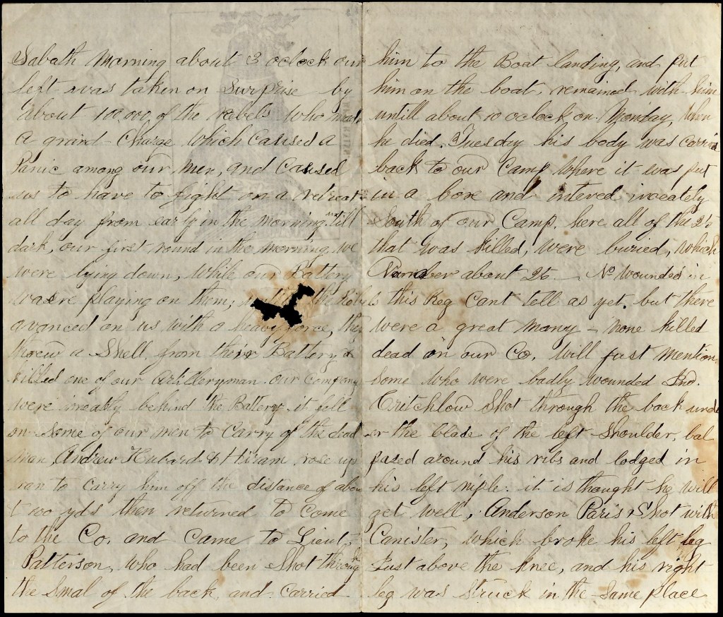 Sabbath morning about 3 o’clock our left was taken on surprise by about 100,000 of the rebels who made a grand charge which caused a panic among our men and caused us to have to fight on a retreat all day from early in the morning until dark. Our first round in the morning, we were lying down while our Battery was playing on them; until the Rebels advanced on us with a heavy force, they threw a shell from their Battery & killed one of our artillerymen. Our company were immediately behind the Battery. It fell on some of our men to carry off the dead man. Andrew Hubbard 1 & Hiram [Huntsucker] 2 rose up, ran to carry him off the distance of about 100 yards, then returned to come to the company and came to [1st] Lieut. [Jesse] Patterson who had been shot through the small of the back and carried him to the Boat landing and put him on the boat, remained with him until about 10 o’clock on Monday when he died. Tuesday his body was carried back to our camp where it was put in a box and interred immediately south of our camp. Here all of the 25 that was killed were buried. which number about 25. Number wounded in this regiment, can’t tell as yet but there were a great many. None killed dead in our company. Will just mention some who were badly wounded.