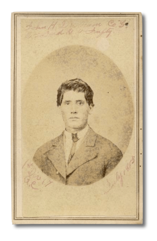 9 John Hardin Durham (1842-1926), enlisted on 19 August 1861 to serve in Co. G, 25th Indiana Infantry, giving his residence as Medora, Jackson county, Indiana. He apparently did not muster out with the service until 1865. though his Find-A-Grave biographical sketch states that he lost one leg and one eye in the war.