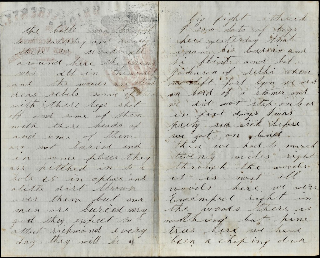 I saw lots of boys here yesterday that I know—Bis. Loudon and Hi Flint and Bob Johnson of Delhi [Delaware county, New York]. 1 When we left Fort Lyon we went on board Odyssey a steamer and we did not step on land in five days. I was pretty sea sick before we got on land. Then we had to march twenty miles right through the woods. It is most all woods here. We were encamped right in the woods. There is nothing but pine trees here. We have been a chopping down the trees to keep the enemy from coming through with their cavalry and artillery.