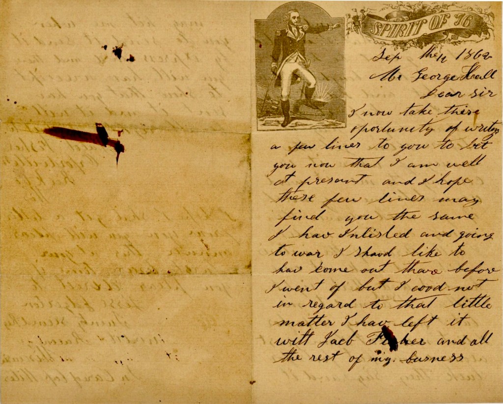 Mr. George Hall, dear sir, I now take this opportunity of writing a few lines to you to let you know that I am well at present and I hope these few lines may find you the same. I have enlisted and going to war. I should like to have come out there before I went off but I could not.