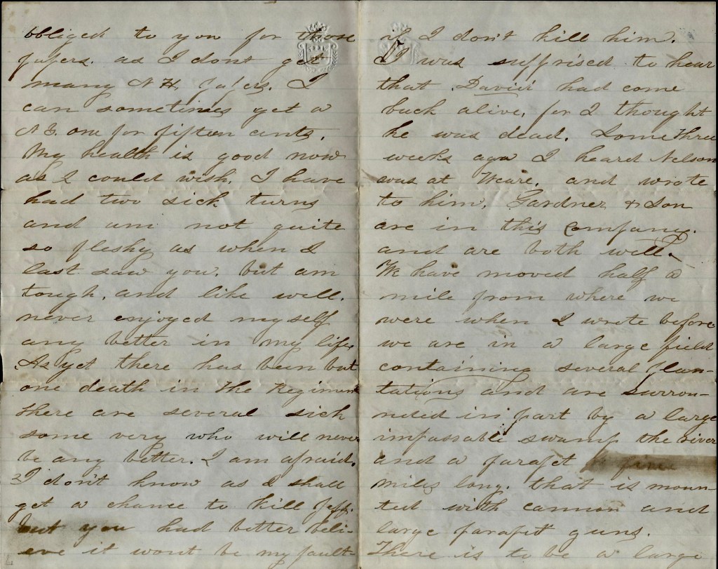 My health is good now as I could wish. I have had two sick turns and am not quite so fleshy as when I last saw you but am tough and like well, never enjoyed myself any better in my life. As yet there has been but one death in the regiment. There are several sick—some very who will never be any better. I am afraid I don’t know as I shall get a chance to kill Jeff [Davis] but you had better believe it won’t be my fault if I don’t kill him. I was surprised to hear that Davis had come back alive for I thought he was dead. Some three weeks ago I heard Nelson was at Weare and wrote to him. Gardner & son are in this company and are both well.