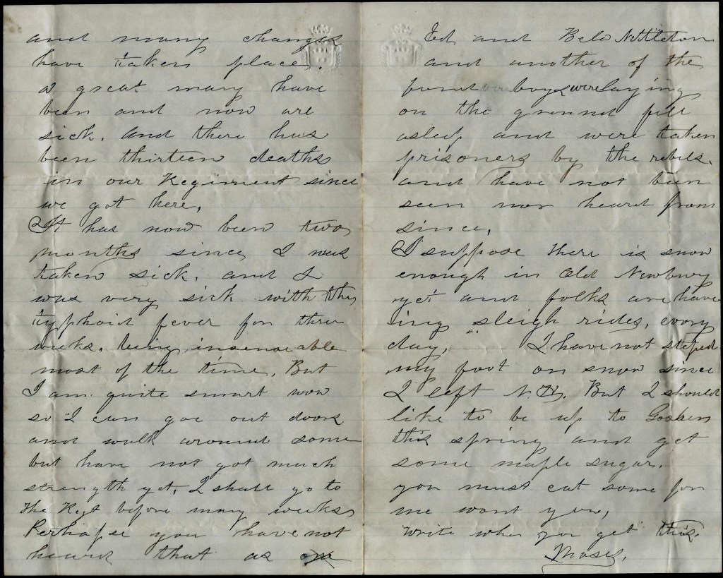 Last night I was very much pleased on receiving a letter from Newbury saying that you were all well as usual. I should like to be with you sugar off. 1 I’ll bet I would enjoy myself eating sugar and molasses with a little bread on it. You know that is the [favorite] I eat.