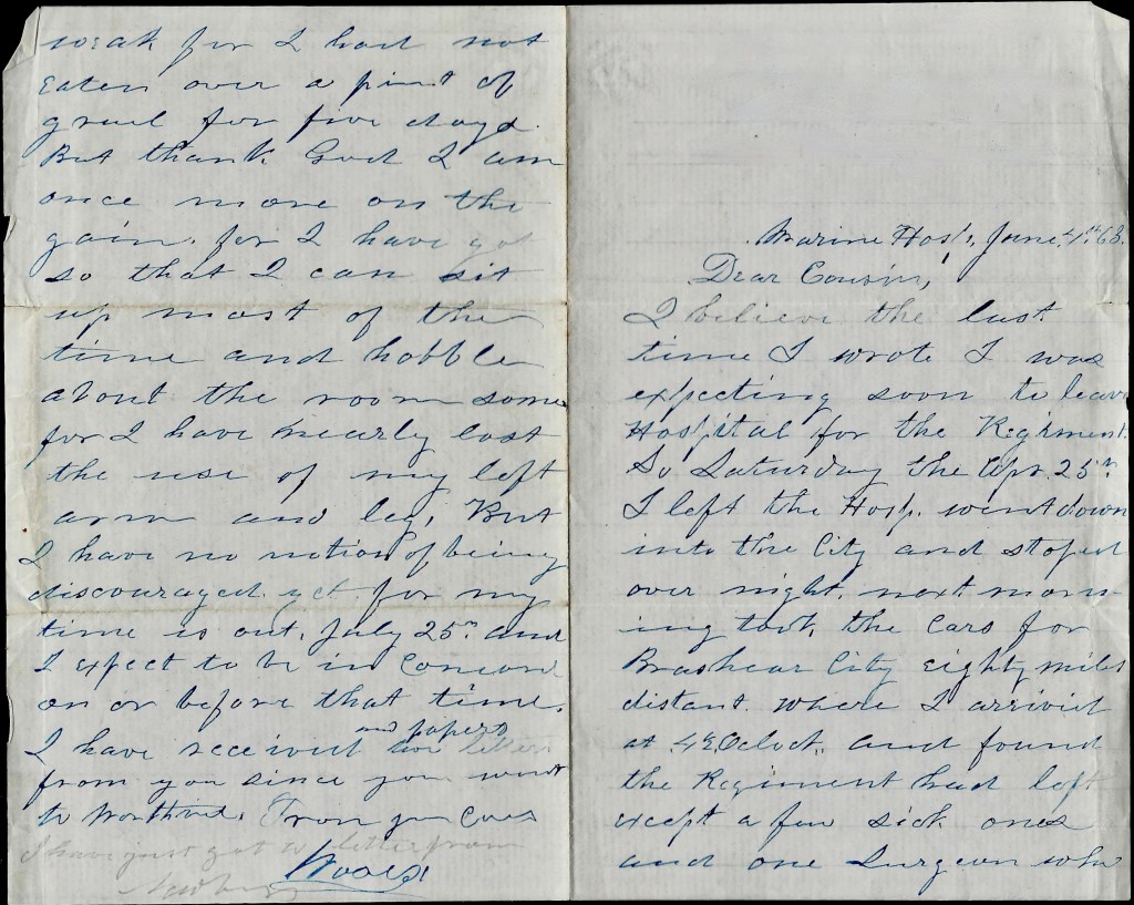 But thank God, I am once more on the gain for I have got so that I can sit up most of the time and hobble about the room some for I have nearly lost the use of my left arm and leg. But I have no notion of being discouraged yet for my time is out July 25th and I expect to be in Concord on or before that time. I have received two letters and papers from you since you went to Worth___. From your cousin, — Moses