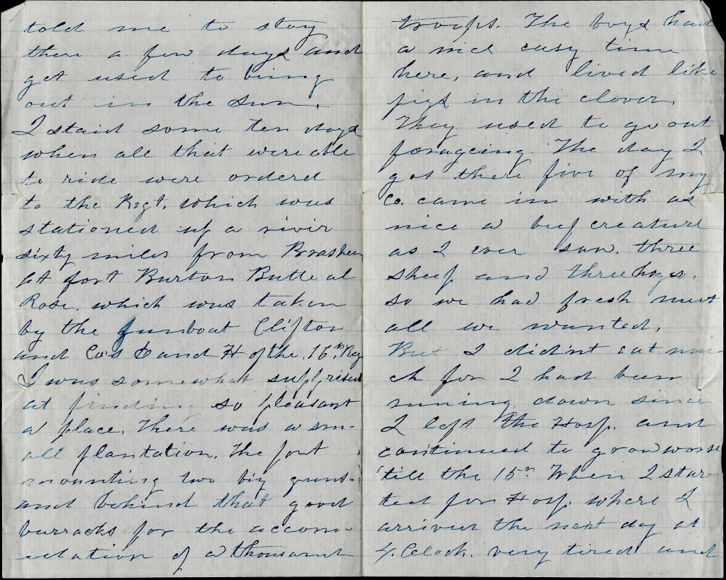 I stayed some ten days when all that were able to ride were ordered to the regiment which was stationed up a river sixty miles from Brashear at Fort Burton at Butte a la Rose, which was taken by the gunboat Clifton and Cos. E and H of the 16th Regiment. 1 I was somewhat surprised at finding so pleasant a place. There was a small plantation. The fort, mounting two big guns, and behind that good barracks for the accommodation of a thousand troops. The boys had a nice, cosy time here and lived like pigs in the clover. They used to go out foraging. The day I got there, five of my company came in with as nice a beef creature as I ever saw, three sheep, and three hogs. So we had fresh meat all we wanted. But I didn’t eat much for I had been running down since I left the hospital and continued to grow worse till the 15th when I started for the hospital where I arrived the next day at 4 o’clock, very tired and weak for I had not eaten over a pint of gruel for five days.