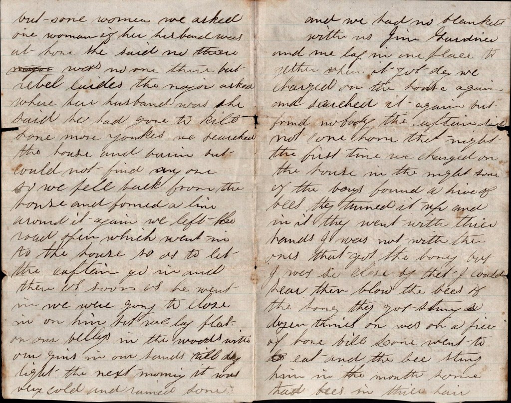 The first time we charged on the house in the night, some of the boys found a hive of bees. They turned it up and in it they went with their hands. I was not with the ones that got the honey but I was so close by that I could hear them blow the bees off the honey. They got stung a dozen times. [ ] went to eat and the bee stung him in the mouth. Some had bees in their hair and down their backs.