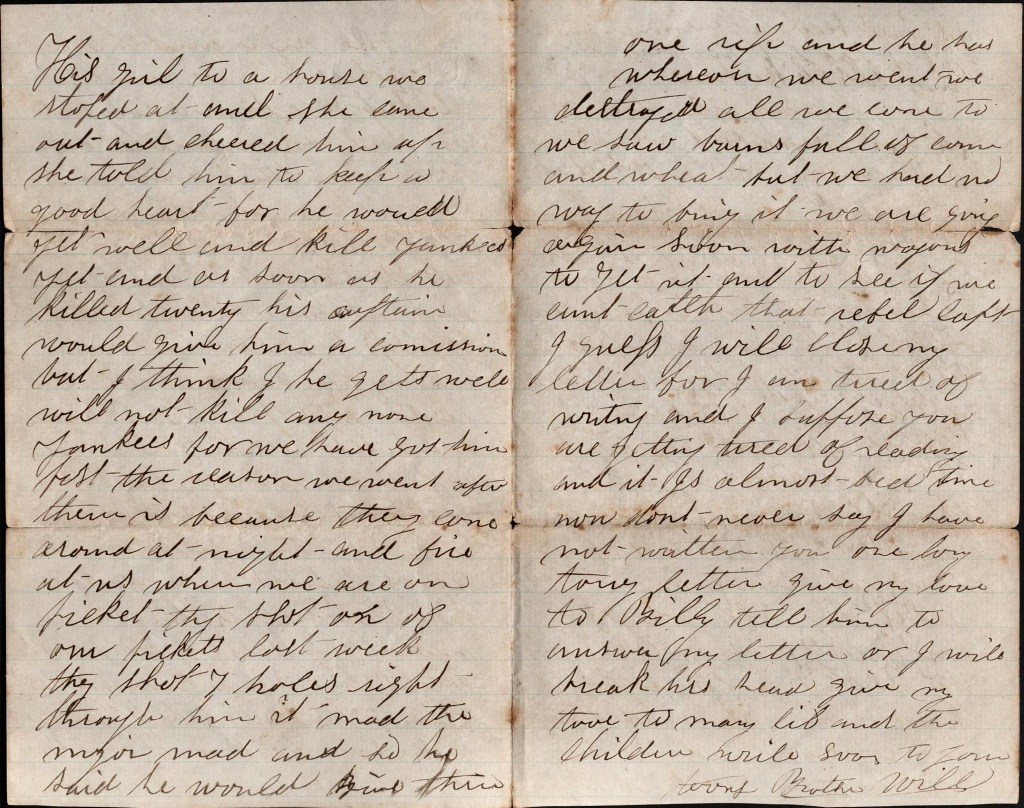We marched 60 miles in less than two days without resting an hour. The first rebel we shot will die, I think, for the bullet is in his side yet. We saw his girl to a house we stopped at and she came out and cheered him up. She told him to keep a good heart for he would get well and kill Yankees yet, and as soon as he killed twenty, his captain would give him a commission. But I think if he gets well, [he] will not kill any more Yankees for we have got him fast. The reason we went after them is because they come around at night and fire at us when we are on picket. They shot one of our pickets last week. They shot 7 holes right through him. It made the Major mad and so he said he would give them one rip and he has, whereon we went [and] we destroyed all we come to. We saw barns full of corn and wheat but we had no way to bring it. We are going again soon with wagons to get it and to see if we can’t catch that rebel captain.
