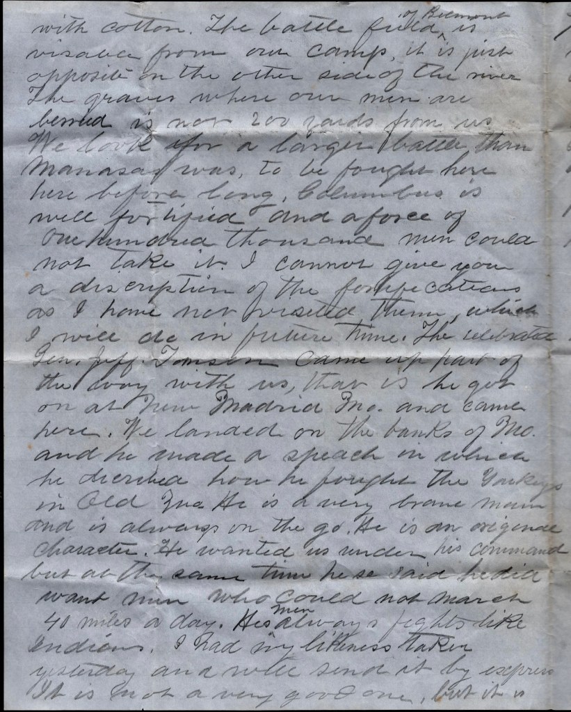 The celebrated Gen. [Meriwether] Jeff T[h]om[p]son came up part of the way with us—that is, he got on at New Madrid, Mo., and came here. We landed on the banks of Missouri and he made a speech in which he described how he fougfht the Yankees in Old Mo. He is a very brave man and is always on the go. He is an original character. He wanted us under his command but at the same time he said he did [not] want men who could not march 40 miles a day. His men always fights like Indians.