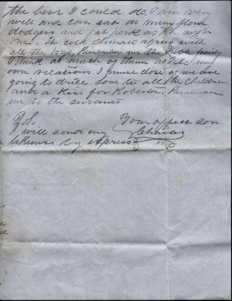 I had my likeness taken yesterday and will send it by express. It is not a very good one, but it is the best I could do. I am very well and can eat as many flour dodgers and fat pork as the next one. The cold climate agrees with all the boys. Remember me [to] the Noble family. I think as much of them as I do my own relations. I must close as we are going to drill. Love to all the children and a kiss for Roberta. Remember me to the servants.