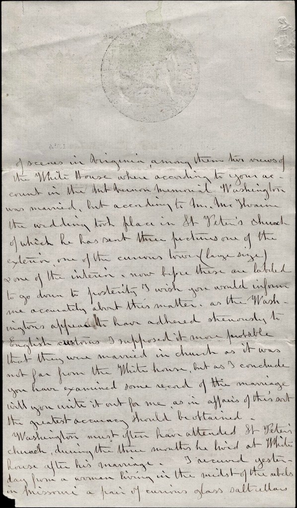 I have been fortunate in securing many fine Washington engravings from F[erdinand] J. Dreer, T. A. McAllister, Kline & others. Wm. McIlvaine, the artist, has painted thirteen beautiful water color sketches of scenes in Virginia, among them two views of the White House where according to your account in the Mt. Vernon Memorial, Washington was married, but according to Mr. McIlvaine, the wedding took place in St. Peters church of which he was sent three pictures—one of the exterior, one of the curious town (large size) and one of the interior. Now before these are labeled to go down to posterity, I wish you would inform me accurately about this matter as the Washington’s appear to a have adhered strenuously to English customs. I supposed it more probable that they were married in church as it was not far from the White house, but as I conclude you have examined some second record of the marriage, will you write it out for me, as in affairs of this sort the accuracy should be obtained. Washington must often have attended St. Peters church during the three months he lived at White house after his marriage.