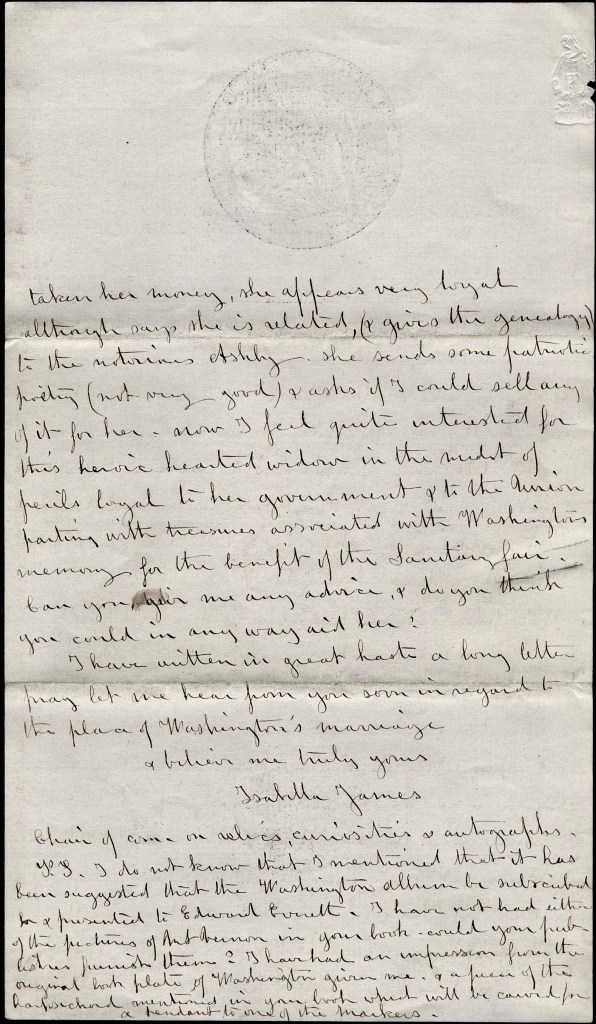 The following letter was written by Isabella (Batchelder) James (1819-1901), the daughter of cotton manufacturer Samuel Batchelder, Jr. (1784-1879) and Mary Montgomery (1790-1869) of New Ipswich, New Hampshire. Isabella married botanist and wholesale druggist Thomas Potts James (1803-1882) in December 1851. She became an outspoken abolitionist, and during the Civil War she offered her house in Philadelphia as a hospital to Massachusetts volunteers and worked in the hospitals and as laborer in the Sanitary Commission. At the Great Centennial Fair in Philadelphia in 1864, she was the head of the Department of Relics and Curiosities which raised money for wounded soldiers. It was during the gathering of these relics that she wrote the following letter in May 1864.