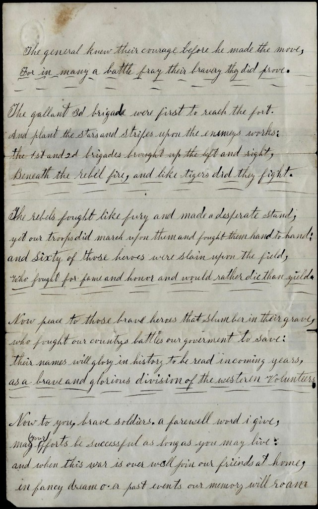 Chester enlisted on 14 April 1864 at Forester, Michigan, to serve as a private in Co. A, 15th Michigan Infantry. He mustered out as a corporal at Little Rock, Arkansas, on 13 August 1865. Let’s hope he was a better soldier than he was a poet.