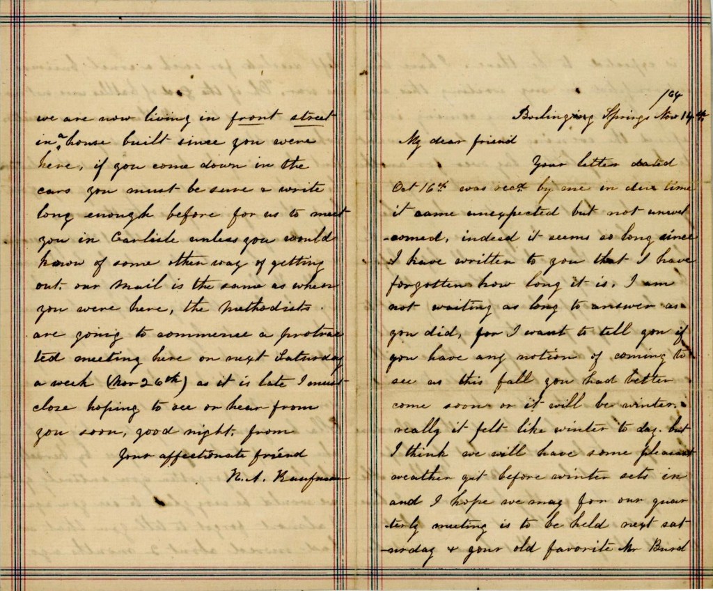 Your letter dated October 16th was received by me in due time. It came unexpected but not unwelcomed. Indeed it seems so long since I have written to you that I have forgotten how long it is. I am not waiting as long to answer as you did, for I want to tell you if you have any notion of coming to see us this fall, you had better come soon or it will be winter. Really it felt like winter today but I think we will have some pleasant weather yet before winter sets in and I hope we may for our Quarterly Meeting is to be held next Saturday & your old favorite Mr. Burd is expected to be there. I have been interrupted in my writing this evening by some company coming in to spend the evening & as I don’t want to leave any letter lay over for another mail, I will try and finish it yet.