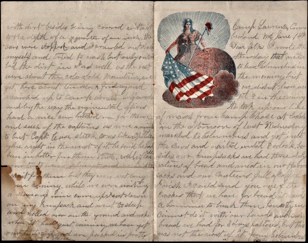 I wrote the other day that we were to leave Columbus in the morning but we didn’t leave until 8 in the evening. We took up our line of march from Camp Chase at 3 o’clock in the afternoon of last Wednesday, marched to Columbus, and got into the cars and waited until 8 o’clock. Besides our knapsacks, we had three days rations of bread and meat in our haversacks and our canteens full of coffee. I wish I could send you one of the crackers that we have for bread. It needs a hammer to break them. Honestly, we cannot do it with our hands and such bread we had for 3 days rations, but this was not the worst of it. From Columbus we went to Bellaire on the Ohio river 4 miles below Wheeling. Got there about noon of Thursday, were ferried across the river and put on the cars immediately and such cars!