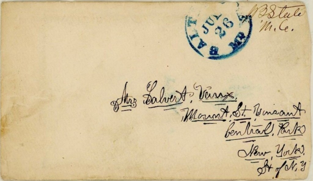The following letter was written by Gerard Lindsley McEntee (1847-1913), the son of James Smith McEntee (1800-1887) and Sarah Jane Goetchius (1805-1883) of Kingston, Ulster county, New York. Gerard had several notable siblings—Jervis McEntee (1828-1891), a Hudson River School Landscape Artist; Mary Swan McEntee (1830-1892), the wife of Calvert Vaux, Landscape architect of NYC who worked with Frederick Law Olmstead in the design of NYC’s Central Park; Lt. Maurice Wurts McEntee (1836-1883), 20th NY State Militia, and later Acting Master in US Navy.