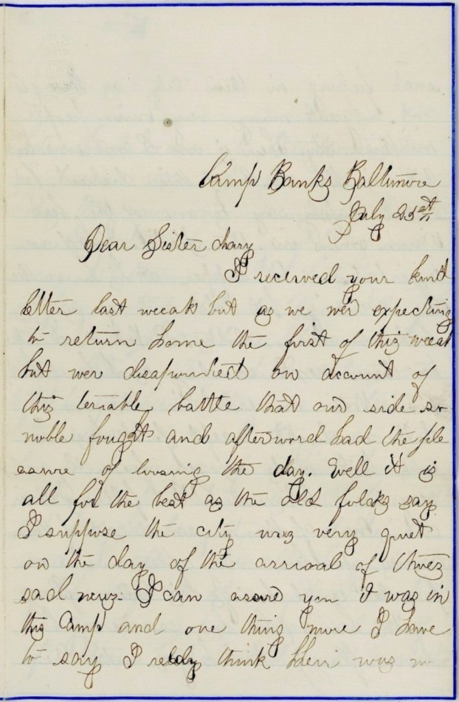 I received your kind letter last week but as we were expecting to return home the first of this week, but were disappointed on account of this terrible battle that our side so noble fought and afterward had the pleasure of losing the day. Well, it is all for the best as the old folks say, I suppose. The city was very quiet on the day of the arrival of the sad news, I can assure you. I was in the camp and one thing more I have to say, I really think there was no [page missing]….have had reason to think so. We were never more disappointed in our lives than we were Wednesday. But the worst of them, hearing of this sad news, set them up to feeling as if they would like to go to the [Manassas] Junction and capture the whole thing themselves while others wanted to go home. They said their time was out and they wanted to go home and enlist for the war. Well their time is out by right but the Secretary of War denies it and I suppose ew will have to stay until the 8th of August.