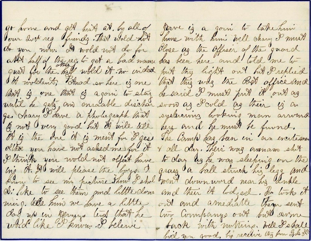 The camp has been in an excitement all day. There was a man shot today as he was sleeping on the grass. A ball struck his leg and went downward near his ankle and there it lodged. Dr. took it out and immediately they sent two companies out but came back with nothing. Well I shall bid you goodbye. This from G. L. Mc.