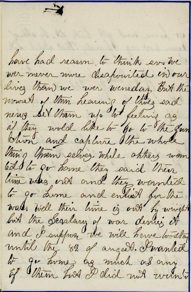 I wanted to go home as much as any of them but I did not want to go home and get hissed at by all of our 20th Regiment friends. That would not do, you know. It would not do for about half of the regiment to get a bad name just for the other half, would it? No indeed it wouldn’t. And so here is one that is a goin’ to stay until he gets an honorable discharge.