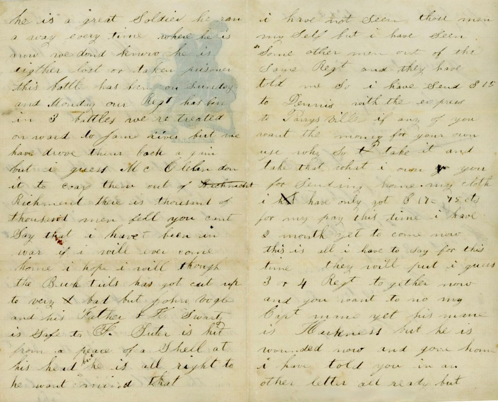 I have sent $15 to Dennis with the Express to Parryville. If any of you want the money for your own use, why so take it and take that what I owe you for sending home my clothes. I have only got $17.75 for my pay this time. I have two months yet to come now. This is all I have to say for this time. They will put, I guess, three or four regiments together now and you want to know my Captain’s name yet. His name is [Thomas C.] Harkness but he is wounded now and gone home. I have told you in another letter already but perhaps you didn’t get it. Yours truly in hand, — John Parker