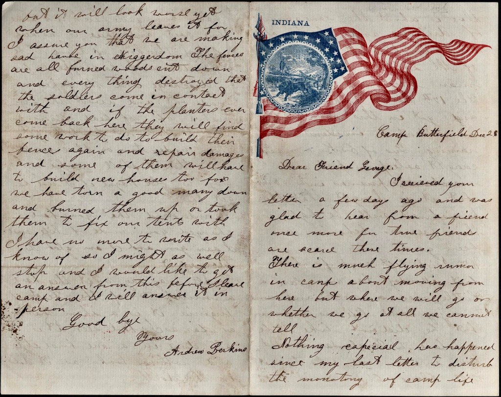 People may say what they have a mind to of the beauty of Virginia. It is a sham—that is, as far as I have seen. It is all done in a one-horse style and nothing looks as it does in the North. But it will look worse yet when our army leaves it for I assure you that we are making sad havoc in Niggerdom. The fences are all burned, woods cut down, and everything destroyed that the soldiers come in contact with. And if the planters ever come back here, they will find some work to do to build their fences again and repair damages and some of them will have to build new houses too for we have torn a good many down and burned them up or took them to fix our tents with.