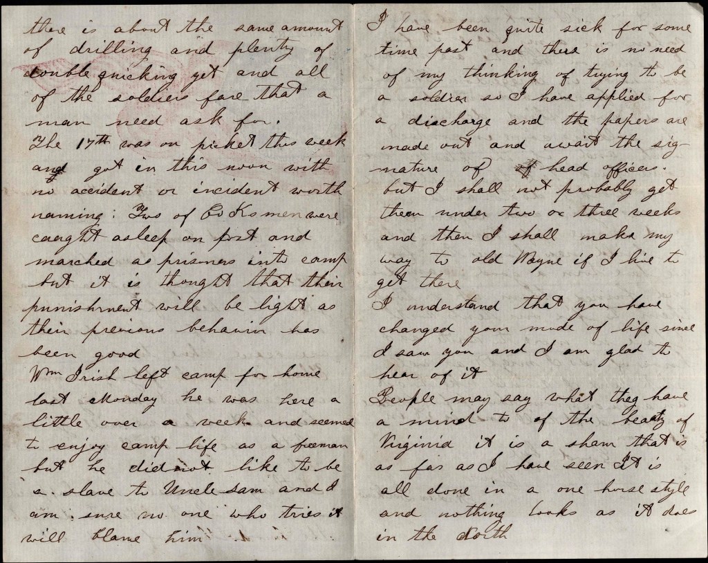 I have been quite sick for some time past and there is no need of my thinking of trying to be a soldier so I have applied for a discharge and the papers are made out and await the signature of head officers but I shall not probably get them under two or three weeks and then I shall make my way to Old Wayne if I live to get there.