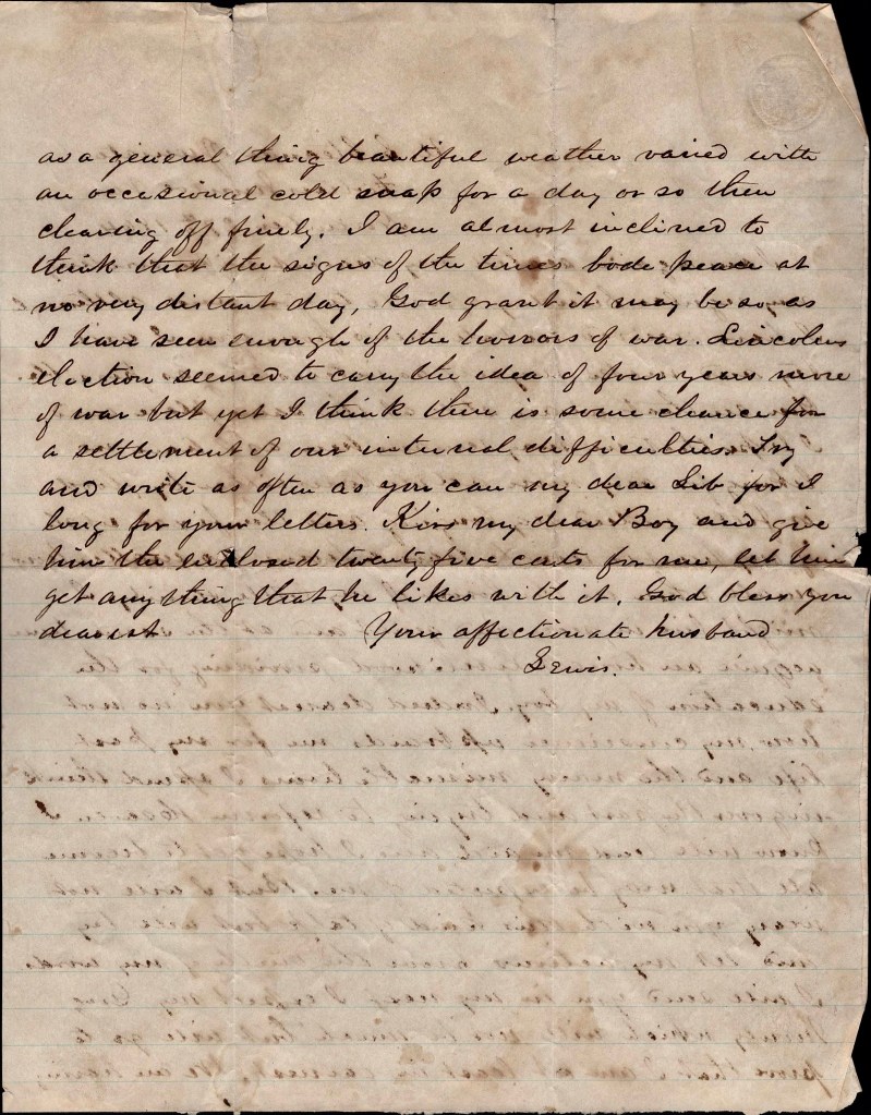 This is Sunday morning and the drum has just beat for inspection so I must close for a short time. It does seem to me that peace must be made before long and I pray for it oh how fervently for I want to be with you to show you, my dear, that I have never ceased to love you and to repay you for this long and cruel separation. This is the only and truest wish of my heart. God grant it may be realized. How fondly does my heart yearn towards my boy. Would that I could see him and be a Father not only in name but in deed. Kiss him for me and may God bless and protect you both. Every pray your fondly attached husband, — Lewis