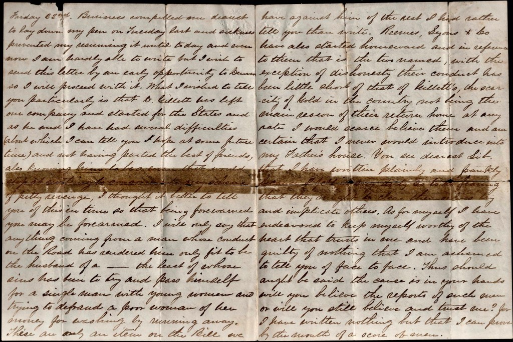 Friday, 22nd. Business compelled me dearest to lay down my pen on Tuesday last and sickness prevented my resuming it until today and even now I am hardly able to write. But I wish to send this letter by an early opportunity to Denver so I will proceed with it. What I wished to tell you particularly is that D. Gillett has left our company and started for the States and as he and I have had several difficulties (about which I can tell you I hope at some future time) and not having parted the best of friends, also knowing him to be a man that would stop at nothing to [illegible] any scheme of petty revenge, I thought it better to tell you of this in time so that being forewarned you may be forearmed. I will only say that anything coming from a man whose conduct on the road has rendered him only fit to be the husband of a ____ the least of whose sins has been to try and pass himself for a single man with young women and trying to defraud a poor woman of her money for washing by running away. These are only an item on the Bill we have against him. Of the rest, I had rather tell you than write. Reemes, Lyons & Co. have also started homeward and in reference to them—that is, the two named, with the exception of dishonesty, their conduct has been little short of that of Gillett’s, the scarcity of gold in the country not being the main reason of their return home. At any rate, I would scarce believe them and am certain that I never would introduce [them] into my Father’s house.