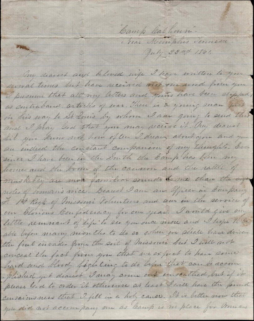 Dearest, I am an officer in Company F, 1st Regiment of Missouri Volunteers and am in the service of our glorious Confederacy for one year. I would give my little remnant of life to see you once more and I hope to be able before many months to do so when we shall have driven the foul invader from the soil of Missouri but I will not conceal the fact from you that we expect to have some hard and bloody fighting to do before that can be accomplished. Yet dearest, I may come out unscathed, but if it please God to order it otherwise, at least I will have the proud consciousness that I fell in a holy cause. It is better now that you did not accompany me as camp is no place for woman and as we are constantly on the move, but just so soon as we get into Missouri, I will do all in my power to have you brought to me—that is, if you will come. We expect to march into Missouri shortly and will endeavor to force our way, driving the enemy before us.