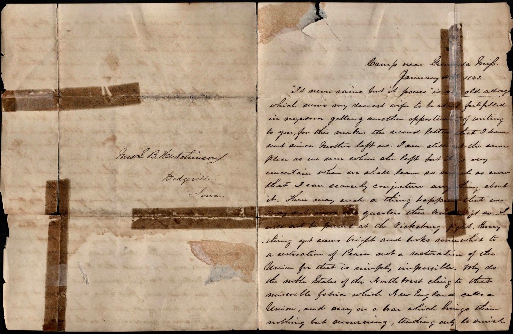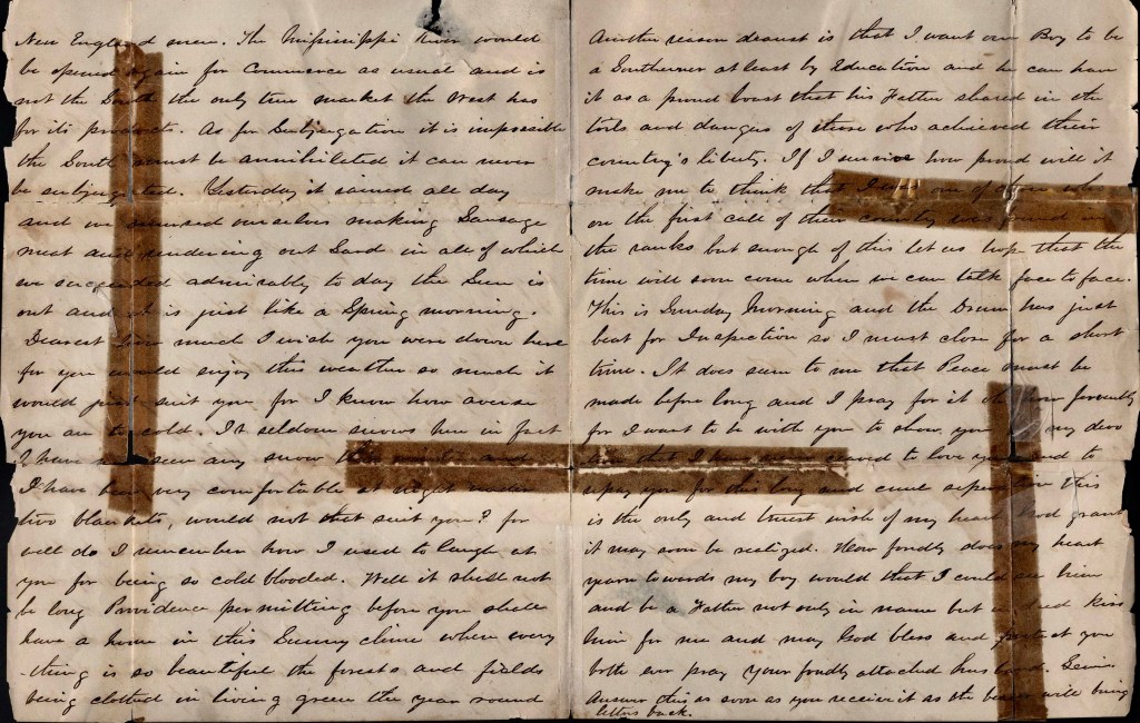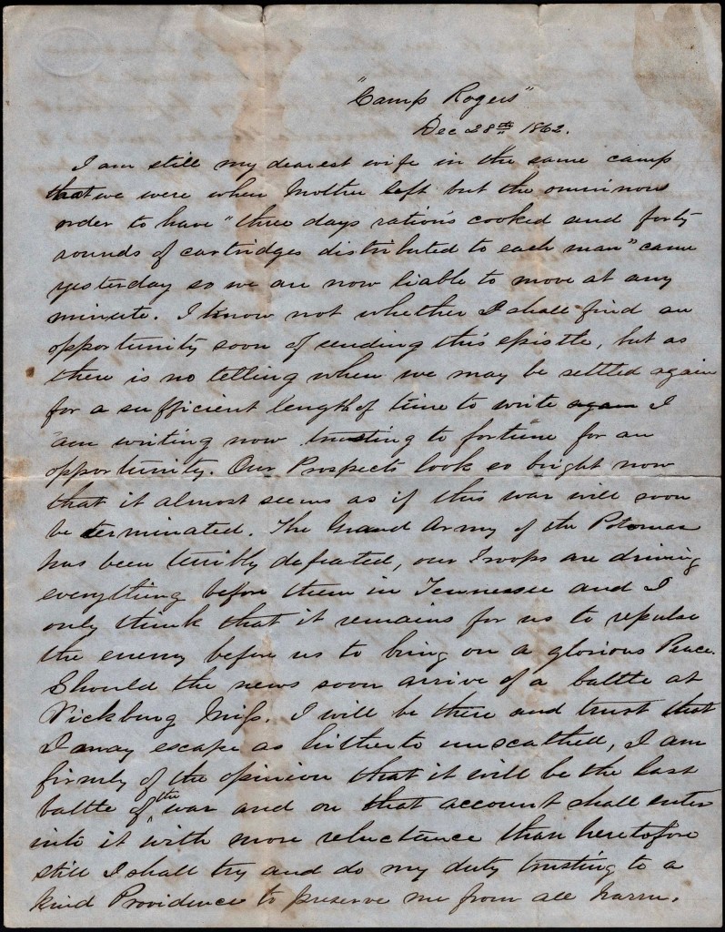 “It never rains but it pours” is an old adage which seems, my dearest wife, to be about fulfilled in my soon getting another opportunity of writing to you for this makes the second letter that I have sent since Mother left us. I am still at the same place as we were when she left but it is very uncertain when we shall leave, so much so now that I can scarcely conjecture anything about it. There may such a thing happen that we may not move our quarters this winter. If so, I will be present at the Vicksburg fight. Everything yet seems bright and looks somewhat to a restoration of peace, not a restoration of the Union for that is simply impossible. Why do the noble states of the Northwest cling to that miserable fabric which New England calls a Union, and carry on a war which brings them nothing but mourning, tending only to [ ] New England men. The Mississippi river would be opened again for commerce as usual and is not the South the only true market the West has for its products? As for subjugation, it is impossible. The South must be annihilated; it can never be subjugated.