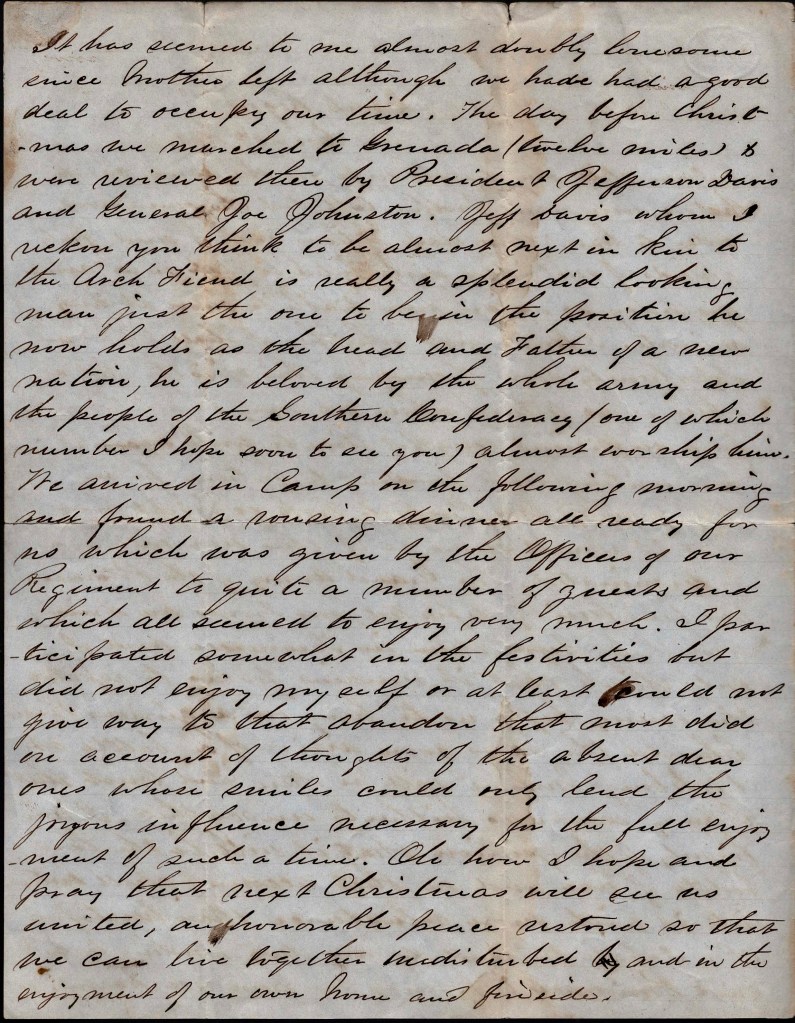 It has seemed to me almost doubly lonesome since Mother left although we have had a good deal to occupy our time. The day before Christmas we marched to Grenada (twelve miles) & were reviewed there by President Jefferson Davis and General Joe Johnston. Jeff Davis, whom I reckon you think to be almost next in kin to the Arch Fiend, is really a splendid looking man—just the one to be in the position he now holds as the head and Father of a new nation. He is beloved by the whole army and the people of the Southern Confederacy (one of which number I hope soon to see you) almost worship him.