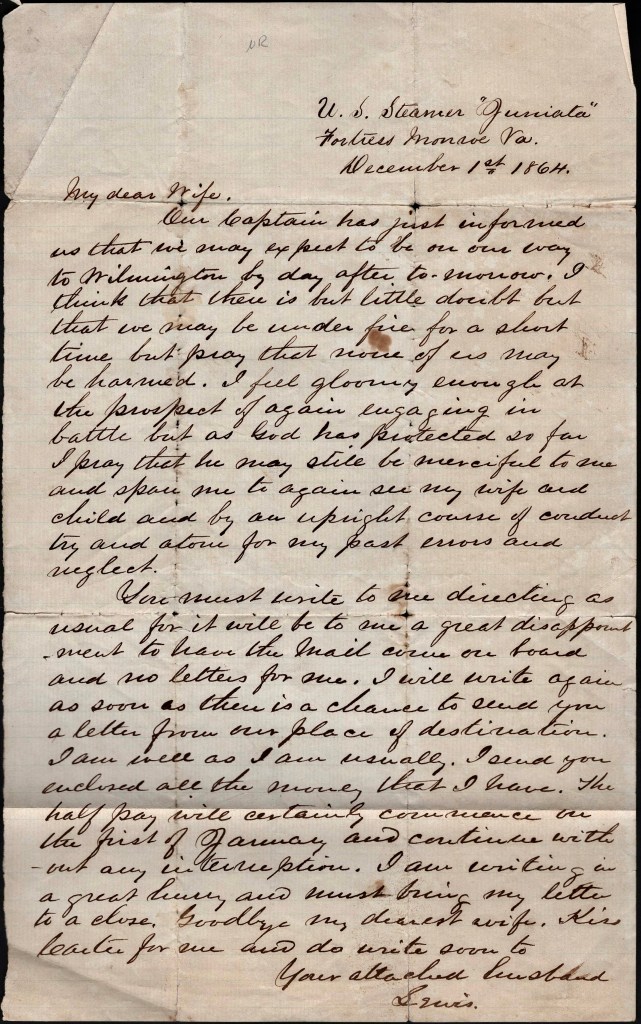 We are still lying at Fortress Monroe but expect to sail this week for the place I have mentioned before. I do wish it was over for really I don’t want to go at all but hope and pray that I may be spared yet a little longer. So Gussie says he is a “good Union boy?” Bless his sweet little mouth. I wish I could kiss him and his Ma too. I suppose he does not remember me at all or if he does, it is only a very faint idea of who I am. You ask me dearest if I am very hungry. I can answer yes—very often, for sea fare is very rough and I often long for a good shore meal. But I will not repine but try and bear up as best I may. Won’t it be a blessed thing if this winter should end the war and I could come home again in the spring. You know not how I wish that I could be with you. Well, I have no more to say—only to beg of you to write to me frequently. Kiss Gussie for me and may Heaven bless you both, my dearest wife. Goodbye. Ever your affectionate husband, — Lewis