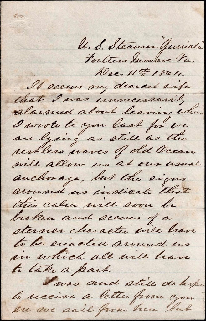 As I have a little time to spare, I thought I would devote it to you, my dear Lib. We are still at anchor lying off “Beaufort” but are ready for sea at a moment’s warning. We have had no correct accounts as yet of our engagement at “Fort Fisher” but know enough to be certain that we did not take it and have but little doubt that before another week is numbered with the past that we will have o renew the attack and more lives will be taken ere the deed is completed. This war is a cruel, murderous business.