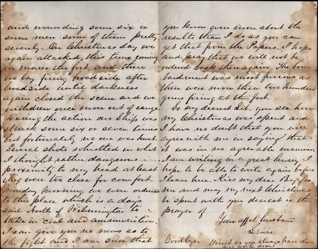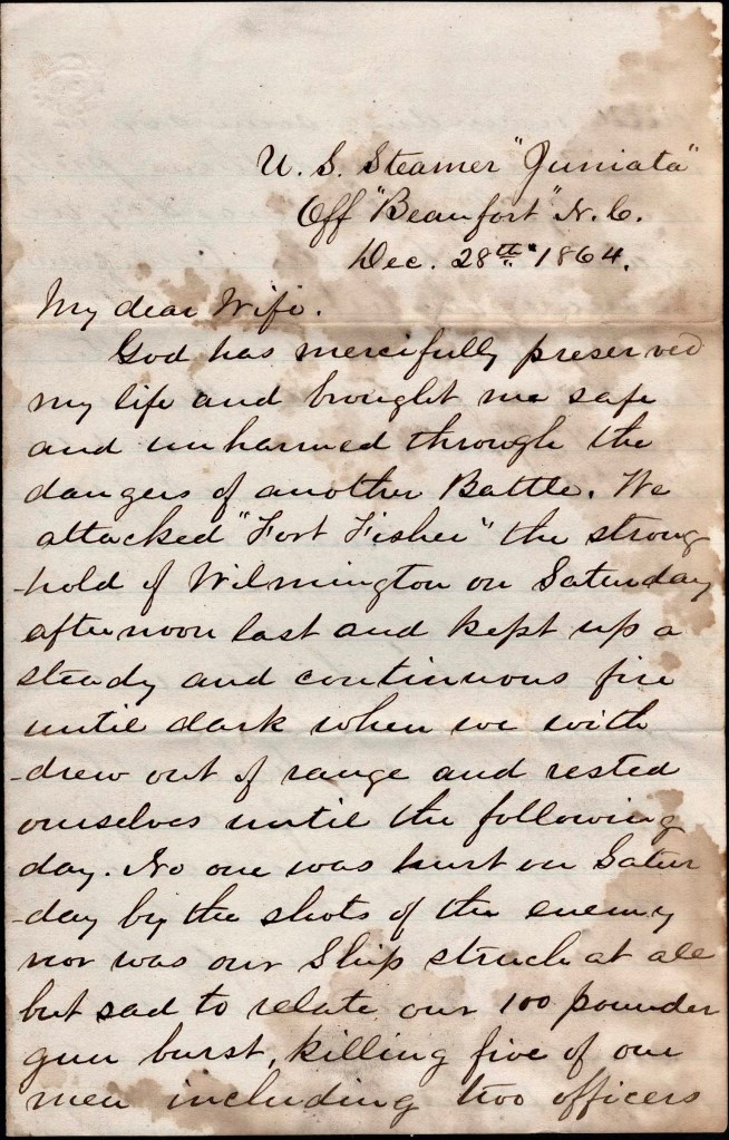God has mercifully preserved my life and brought me safe and unharmed through the danger of another battle. We attacked “Fort Fisher” the stronghold of Wilmington on Saturday afternoon last and kept up a steady and continuous fire until dark when we withdrew out of range and rested ourselves until the following day. No one was hurt on Saturday by the shots of the enemy nor was our ship struck at all but sad to relate our 100-pounder gun burst, killing five of our men including two officers and wounding some six or seven men, some of them pretty severely.