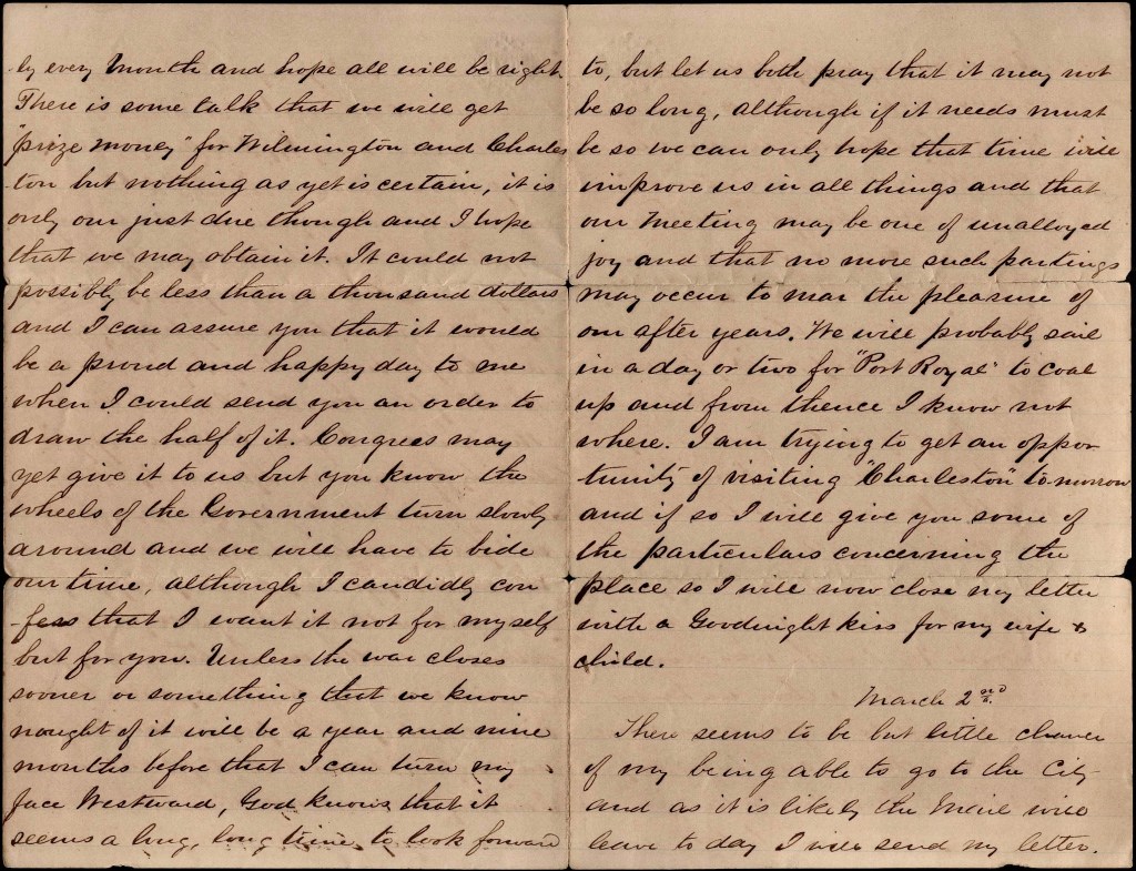 There is some talk that we will get “prize money” for Wilmington and Charleston but nothing as yet is certain. It is only our just due though and I hope that we may obtain it. It could not possibly be less than a thousand dollars and I can assure you that it would be a proud and happy day to me when I could send and order to draw the half of it. Congress may yet give it to us but you know the wheels of the government turn slowly around and we will have to bide our time, although I candidly confess that I want it not for myself but for you. Unless the war closes sooner or something that we know naught of, it will be a year and nine months before that I can turn my face westward. God knows that it seems a long, long time to look forward to, but let us both pray that it may not be so long. Although it needs must be so, we can only hope that time will improve us in all things and that our meeting may be one of unalloyed joy and that no more such partings may occur to mar the pleasure of our after years.