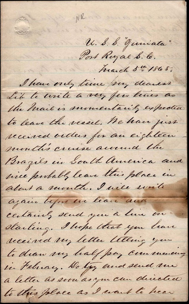 I was very much surprised and disappointed in not receiving any answer to my letter on my return from a week’s cruise day before yesterday. I wrote you a long letter some time ago, my dearest Lib, telling you where I was and what doing, and have also written to Father & Mother but have received no answer a yet. What is the reason that you don’t write? I told you in my letter that you must be certain to write to the Navy Agent in Philadelphia and draw my half pay which certainly is not much but it is all I have at present.