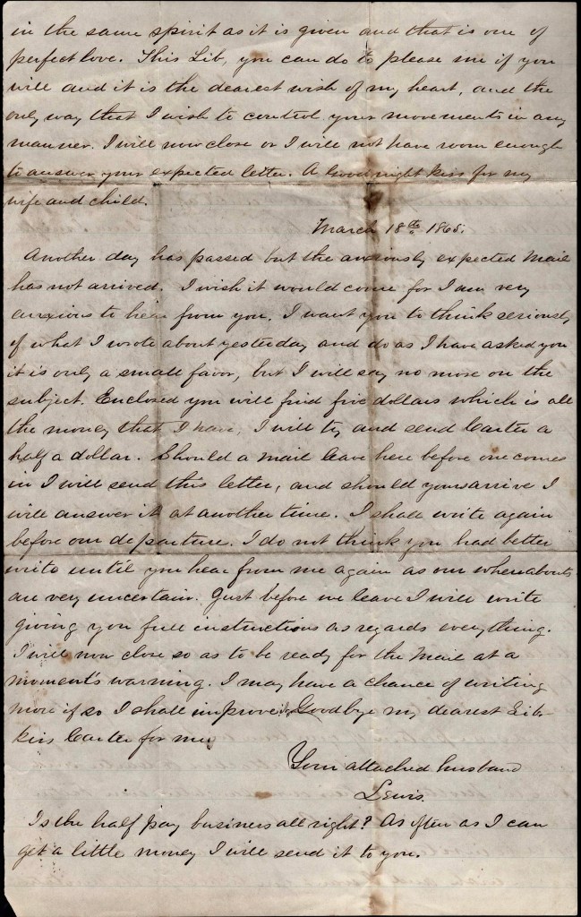 March 18th 1865. Another day has passed but the anxiously expected mail has not arrived. I wish it would come for I am very anxious to hear from you. I want you to think seriously of what I wrote about yesterday and do as I have asked you. It is only a small favor, but I will say no more on the subject. Enclosed you will find five dollars which is all the money that I have. I will try and send Carter a half dollar. Should a mail leave here before one comes in I will send this letter and should yours arrive, I will answer it at another time. I shall write again before our departure. I do not think you had better write until you hear from me again as our whereabouts are very uncertain. Just before we leave, I will write giving you full instructions as regards everything. I will now close so as to be ready for the mail at a moment’s warning. I may have a chance of writing more. If so, I shall improve. Goodbye my dearest Lib. Kiss Carter for me. Your attached husband, — Lewis