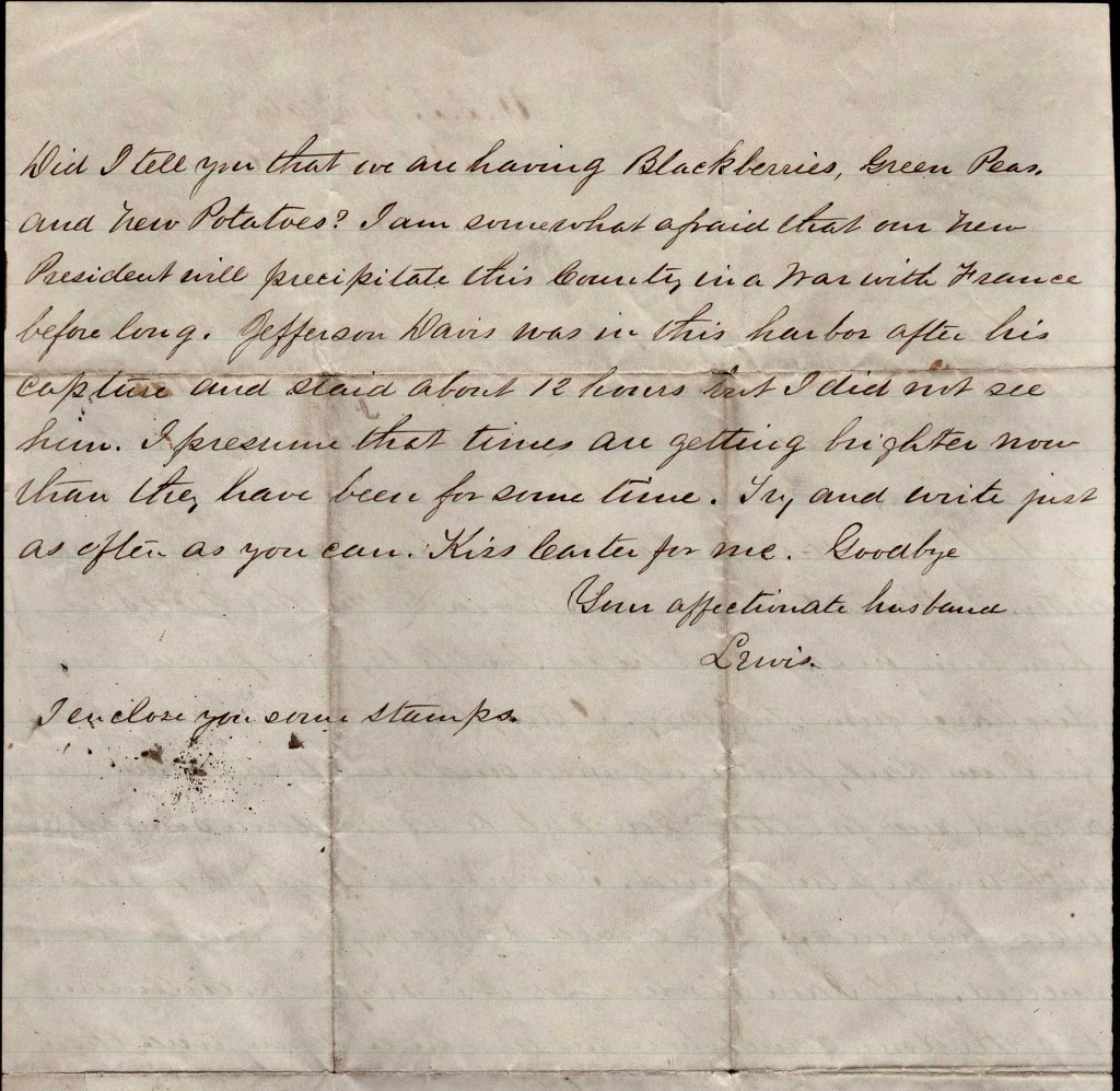 Did I tell you that we are having blackberries, green peas, and new potatoes? I am somewhat afraid that our new President will precipitate this country in a war with France before long. Jefferson Davis was in this harbor after his capture and stayed about 12 hours but I did not see him. I presume that times are getting brighter now that they have been for some time. Try and write just as often as you can. Kiss Carter for me. Goodbye. Your affectionate husband, — Lewis