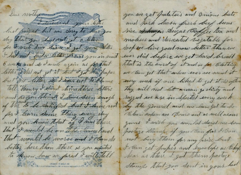 As you wanted to know how we fared, I will tell you. We get potatoes and onions, beets and pork bacon, fresh beef, beans, rice, sugar, coffee, tea, and molasses and desecrated vegetable for soup. We live good now—better than we ever did before. We get hard bread—that is the worst of it. And as for clothing, we can get that whenever we want it. Every week if one liked to get it. So often they will not let a man go dirty and ragged. We are inspected every week by the general and we have got to be clean when we come out, as well as our guns.