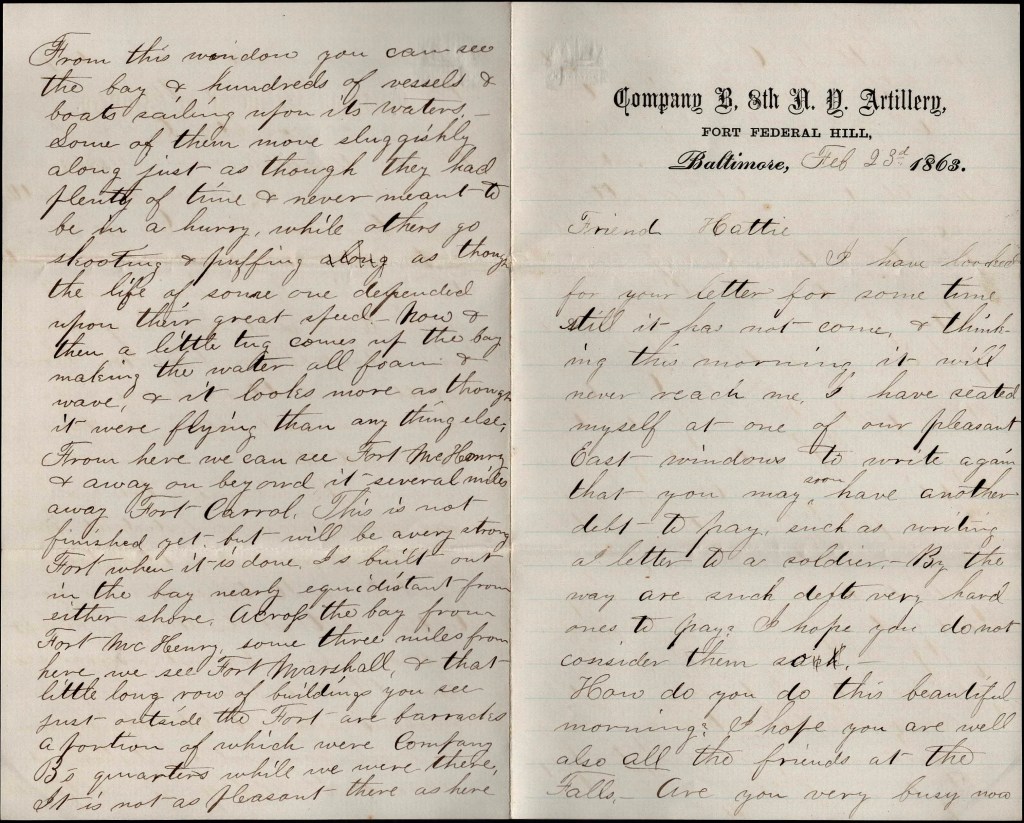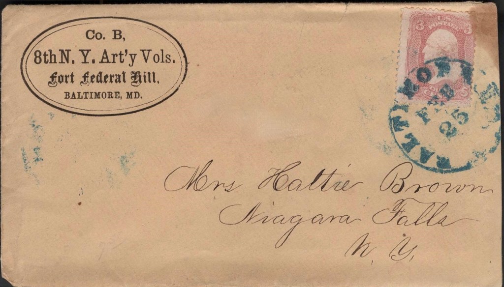 Though it is only signed Thomas, I feel confident this letter was written by Thomas C. Edwards (b. 1835) who served in Co. B, 8th New York Heavy Artillery. The regiment was organized at Lockport, New York as the 129th New York Volunteer Infantry and mustered on August 22, 1862, for three years service under the command of Colonel Peter Augustus Porter. Because heavy artillery regiments were needed for the defenses of Baltimore, the regiment was converted from infantry on October 3, 1862, and became the 8th New York Heavy Artillery on December 19, 1862. Companies L and M joined the regiment at Baltimore in February 1864.