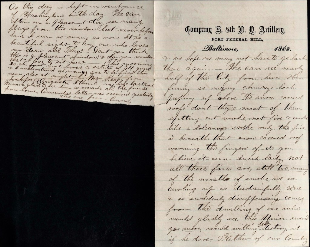 As this day is kept in remembrance of Washington’s birthday, we can often on a pleasant day see many flags from this window, but never before have I seen so many as now. It is a beautiful sight to anyone who loves our “dear old flag.” Don’t you think this is a pleasant window? And do you wonder that I love to sit here? This morning each fort here fired a salute of 34 guns & I understand as many are to be fired this noon, also at night. Mr. Keef from Lockport (Augustus) was here last week. We were glad to see him as were all the friends from home. Amanda’s letter was received yesterday. Also one from Ann.