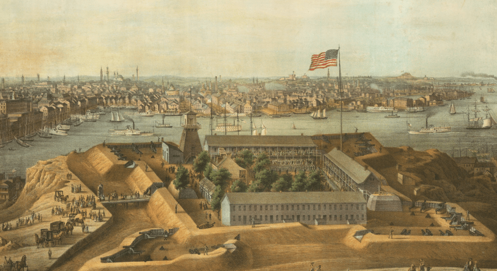 Isn’t this a pleasant place? From this window you can see the bay and hundreds of vessels & boats sailing upon its waters. Some of them more sluggishly along just as though they had plenty of time & never meant to be in a hurry, while others go shooting and puffing as though the life of someone depended upon their great speed. Now and then a little tug comes up the bay making the water all foam & wave, and it looks more as though it were flying than anything else. From here we can see Fort McHenry and away and beyond it several miles away Fort Carroll. This is not finished yet, but will be a very strong fort when it is done. It’s built out in the bay nearly equidistant from either shore. Across the bay from Fort McHenry some three miles from here we see Fort Marshall & that little long row of buildings you see just outside the fort are barracks, a portion of which were Co. B’s quarters while we were there. It is not as pleasant there as here and we hope we may not have to go back there again.