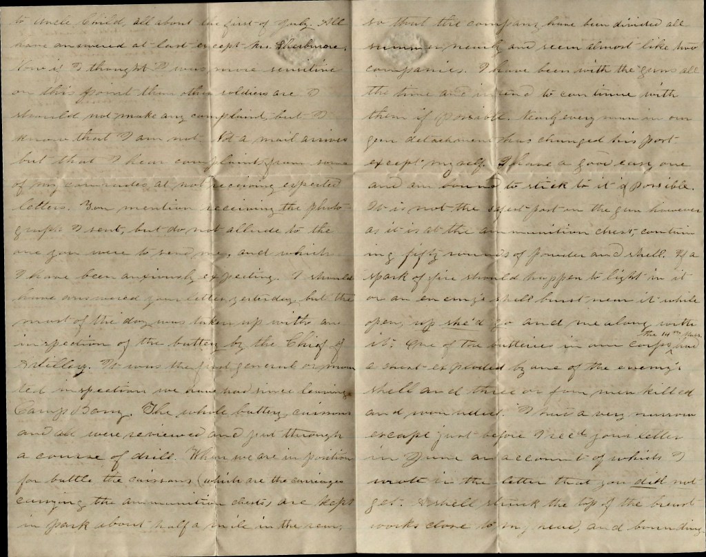 I should have answered your letter yesterday but the most of the day was taken up with an inspection of the battery by the Chief of Artillery. It was the first general or mounted inspection we have had since leaving Camp Barry. The whole battery, caissons and all, were reviewed and put through a course of drill. When we are in position of battle, the caissons (which are the carriages carrying the ammunition chests) are kept in park about half a mile in the rear so that the company have been divided all summer nearly and seem almost like two companies. I have been with the guns all the time and intend to continue with them if possible. Nearly every man in our detachment has changed his post except myself. I have a good easy one and am bound to stick to it if possible. It is not the safest post on the gun, however, as it is at the ammunition chest containing fifty rounds of powder and shell. If a spark of fire should happen to light in it or the enemy’s shell burst near it while open, up she’d go and me along with it. One of the batteries in our Corps—the 14th Massachusetts—had a chest exploded by one of the enemy’s shell and three or four men killed and wounded.