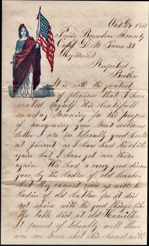 It is with the greatest of pleasure that I have seated myself this beautiful Sunday morning to the purpose of answering your most welcome letter. I am in tolerably good health at present as I have had the chills again but I have got over them again. We had a very good dinner gave by the ladies of Old Bourbon but they cannot come up with the ladies of Old Butler for it did not shine with the good things like the table did at Old Hamilton. It passed off tolerably well. There was one man shot his hand with a pistol and there was one fell down last night while going around on guard and his gun went off and shot another man in the foot. This is the third or fourth accident of this kind has happened. I think that we have some of the most careless people in the regiment that anybody ever seen.