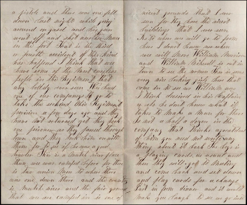 William Morrison and William Mikesell is out in town to see the women. There is some very nice looking girls here that come in to see us. William was, I think, deceived in his Captain or else he don’t know what it takes to make a man, for there is not a half a dozen in the company that thinks a great deal of him. You need not write anything about it back The boys is a playing cards as usual and then they will go to Meeting and come back and sit down and play cards for a change. Just in from dinner, and it would make you laugh to see us go into…. [rest of letter is missing]
