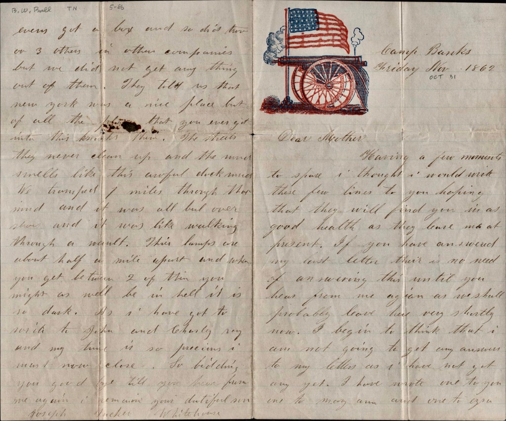 The following letter was written by 19 year-old Joseph Tucker Whitehouse (1843-1910) who enlisted in October 1862 as a private in Co. H. 42nd Massachusetts Infantry. He mustered out of the regiment on 20 August 1863. The various companies of the 42nd Massachusetts were mustered in between Sept. 13 and Oct. 14, 1862, while the field and staff were not mustered until Nov. 11. Under command of Colonel Isaac S. Burrell, the regiment left Nov. 21st for Camp Banks, Long Island, N. Y., where the “Banks Expedition” for Louisiana was being organized. From here on the 3d of December, it took transports for New Orleans.