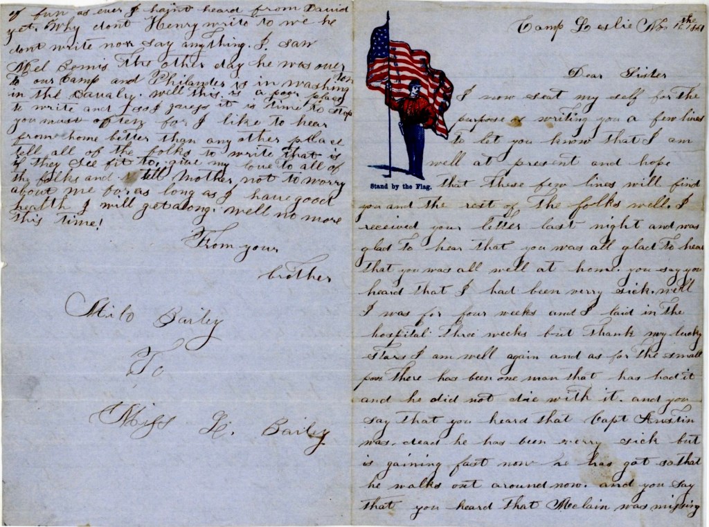 And you say that you heard that Capt. [Thomas M.] Austin was dead. He has been very sick but is gaining fast now. He has got so that he walks out around now. And you say that you heard that McClain was missing but that is a mistake for he is here. As for my coming home, you need not expect me until the regiment comes which will not be long. We expect to stay in this camp this winter.