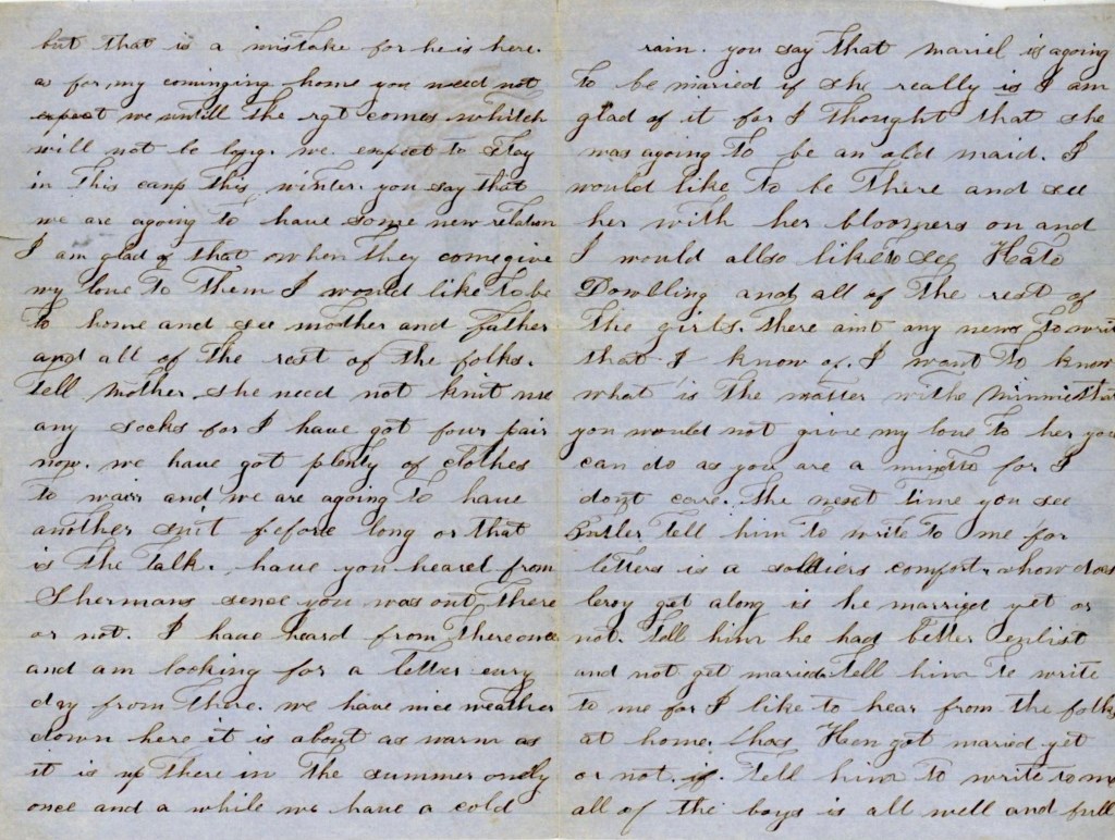 We have nice weather down here. It is about as warm as it is up there in the summer, only once and a while we have a cold rain. You say that Mariel is agoing to be married. If she really is, I am glad of it for I thought that she was agoing to be an old maid. I would like to be there and see her with her bloomers on and I would also like to see Kate Dowling and all of the rest of the girls. There ain’t any news to write that I know of. I want to know what is the matter with Minnie that you would not give my love to her. You can do as you are a mind to for I don’t care. The next time you see Butler, tell him to write to me for letters is a soldier’s comfort. How does Leroy get along? Is he married? Tell him to write to me for I like to hear from the folks at home…